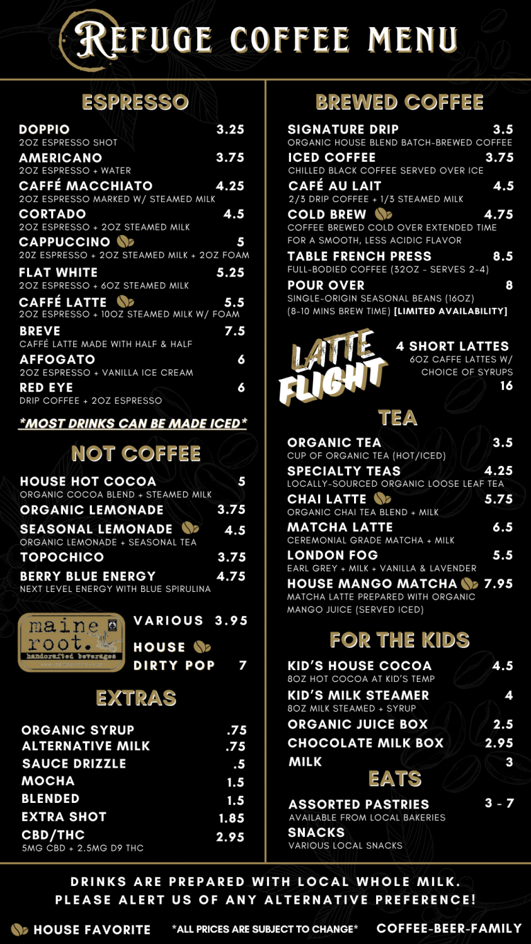 At Refuge Coffee and Beer, every brew tells a story — a story of care, community, and craftsmanship. We start with fair-trade, organic coffee beans, sourced thoughtfully to support farmers and sustainable practices. Locally sustainably roasted in small batches, our coffee is always fresh, vibrant, and full of character.